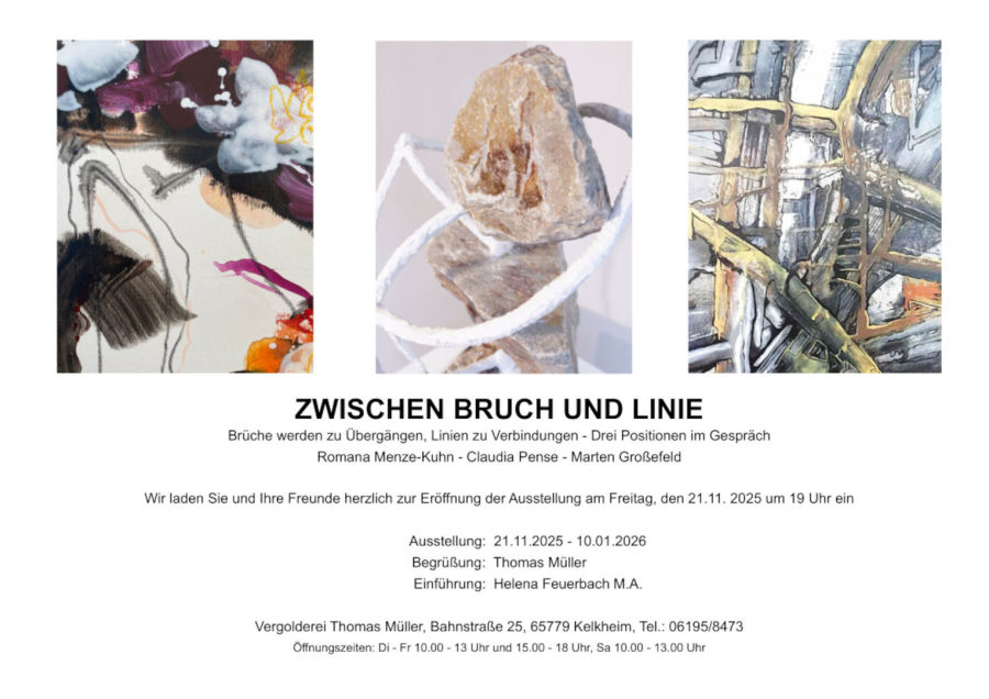 Im Rahmen der Ausstellung „Zwischen Bruch und Linie“ werden wir, meine großartigen Kolleginnen Romana Menze-Kuhn, Claudia Pense sowie ich, unsere Arbeiten in der Vergolderei in Kelkheim zeigen.